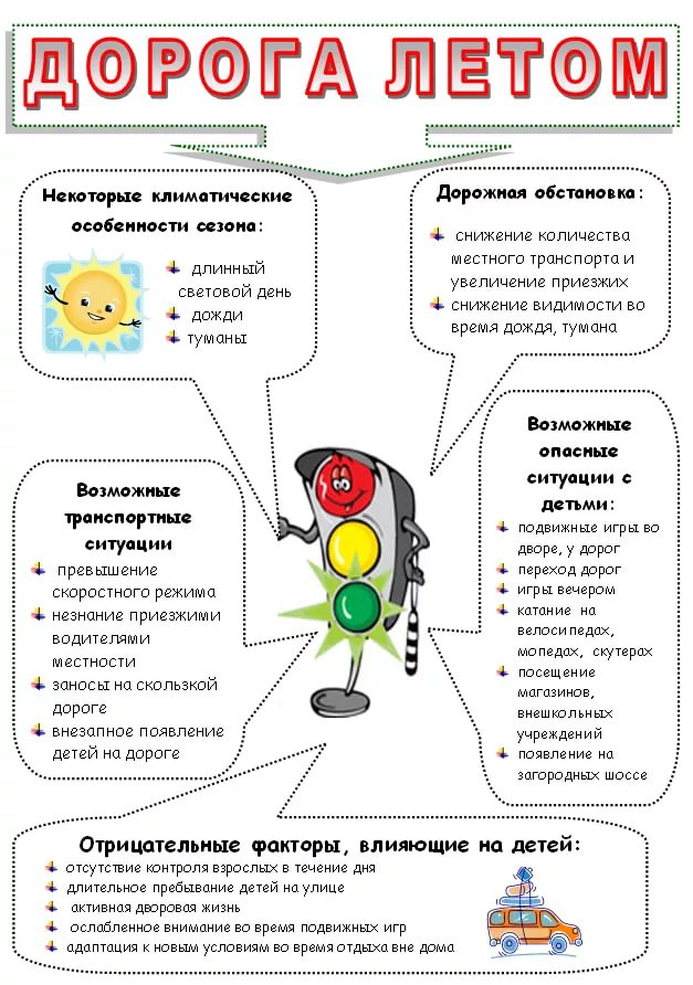 Наступило лето, в тёплую солнечную погоду дети больше времени проводят на улице. В связи с этим хочется напомнить вам о некоторых правилах дорожной безопасности в летний период.
